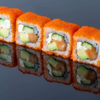 Nori, riis, krabi tartar, avokaado, kurk, tobiko, firmale omane hapu kaste, seesam